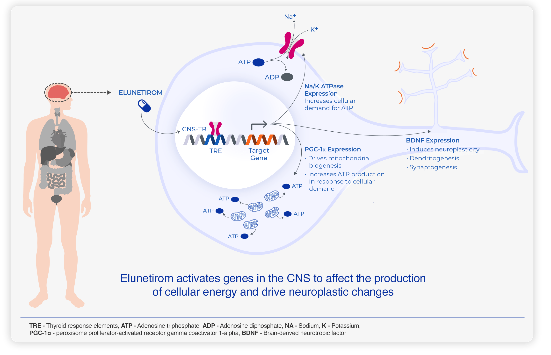 MDD is the third most common cause of disability worldwide, and leaves patients suffering from an exasperated state of helplessness, grief, and increased suicidality. Further, depression remains a prominent, underserved, and chronic feature of bipolar disorder, where patients experience intense emotional states of both highs (mania or hypomania) and lows (depression). In the CNS, thyroid hormone has a pluripotent mechanism through which it regulates mood and emotional processing. Thyroid hormone has shown to increase brain bioenergetics and cellular energy metabolism in depression patients who respond to T3 or T4 and drives structural neuroplasticity in the frontal cortex. In behavioral models of exploratory behavior and decision-making, T3 activates nuclear transcriptional programs responsible for regulatory processes and the downstream production of proteins, leading to an increase in synaptic plasticity.